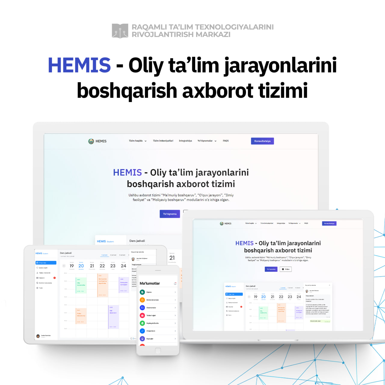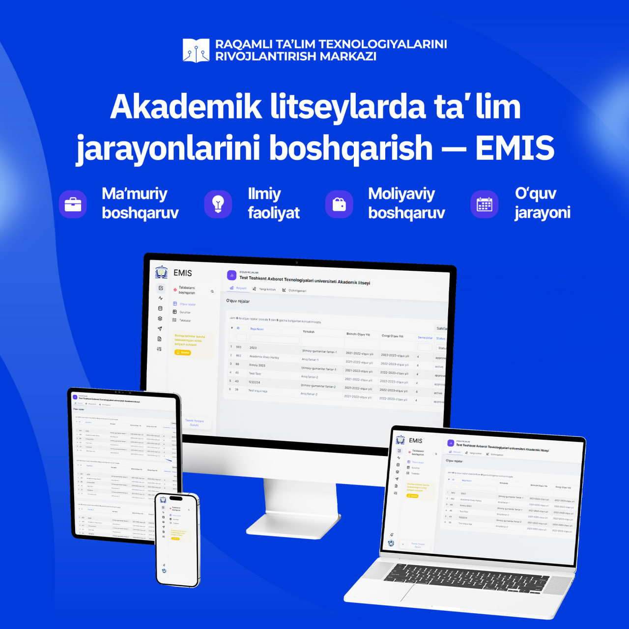 "Ma'muriy boshqaruv", "O‘quv jarayoni", "Ilmiy faoliyat" va "Moliyaviy boshqaruv" axborot tizimlarini o‘z ichiga olgan.