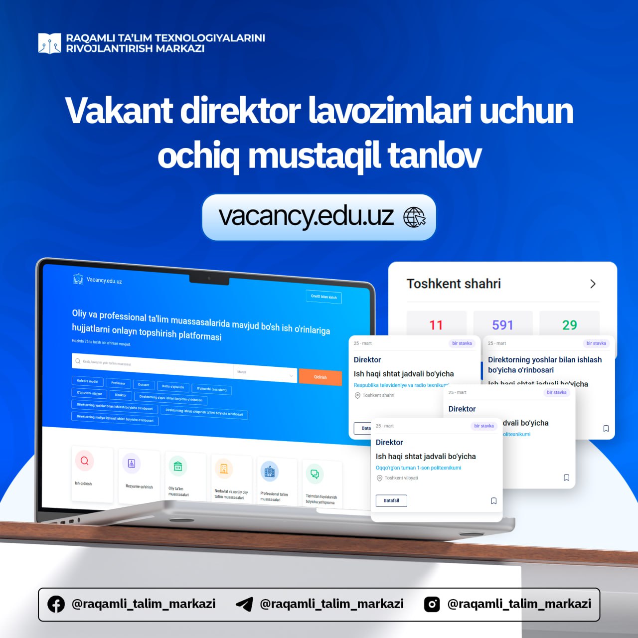 oliy va professional ta`lim muassasalarida mavjud bo`sh ish o`rinlariga hujjatlarni onlayn topshirish platformasi